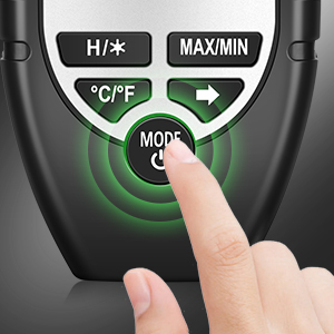 مرحله 1: 1. لطفاً دکمه ON/OFF را فشار دهید تا رطوبت سنج راه اندازی شود. 2. برای انتخاب حالت اندازه گیری چوب یا مصالح ساختمانی، MODE را فشار دهید