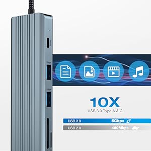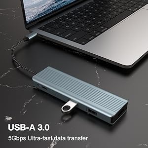 سازگاربا کارت خوان های جهانی: این هاب USB دارای 4 پورت USB 3.0 (3 USB-A و 1 USB-C) با سرعت انتقال سریع 5 گیگابیت بر ثانیه است که آن را برای مدیریت داده ها، عکس ها و تصاویر حساس به زمان شما عالی می کند. و انتقال فیلم از تلفن به لپ تاپ. کارت خوان های SD و TF سازگار جهانی، افزایش فضای ذخیره سازی تا 2 ترابایت را امکان پذیر می کند. علاوه بر این، دارای یک پورت USB 2.0 برای لوازم جانبی بی سیم مانند ماوس و کیبورد است.