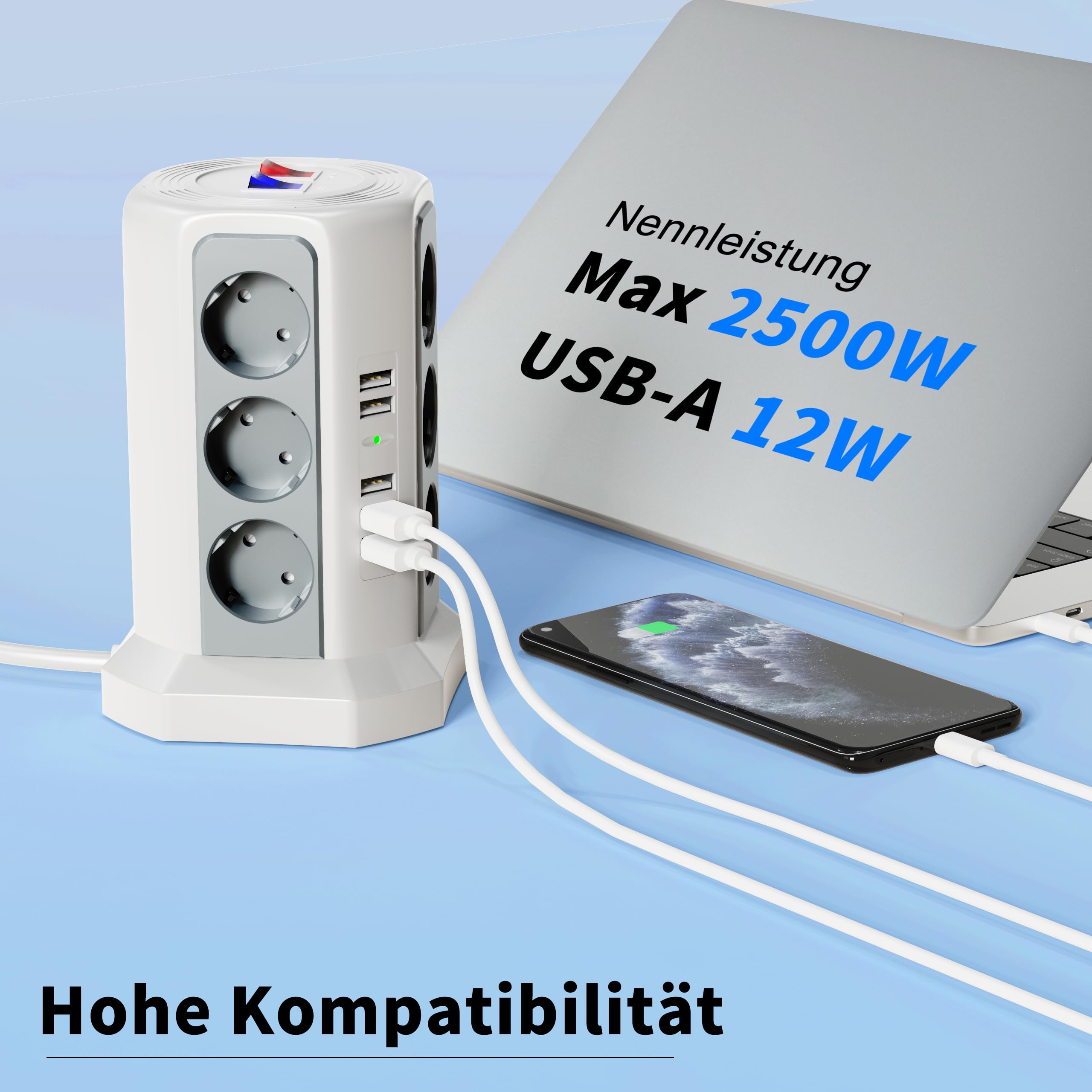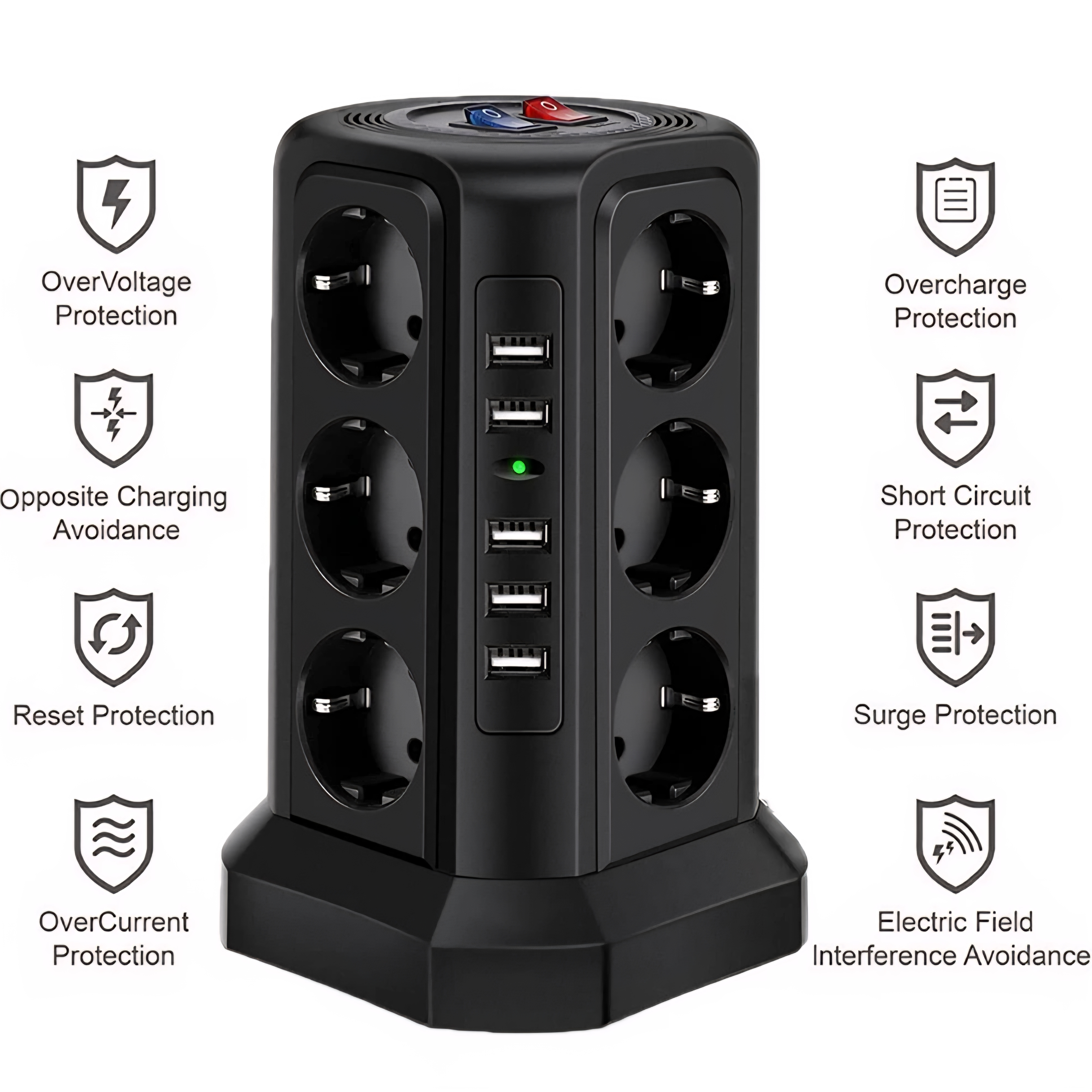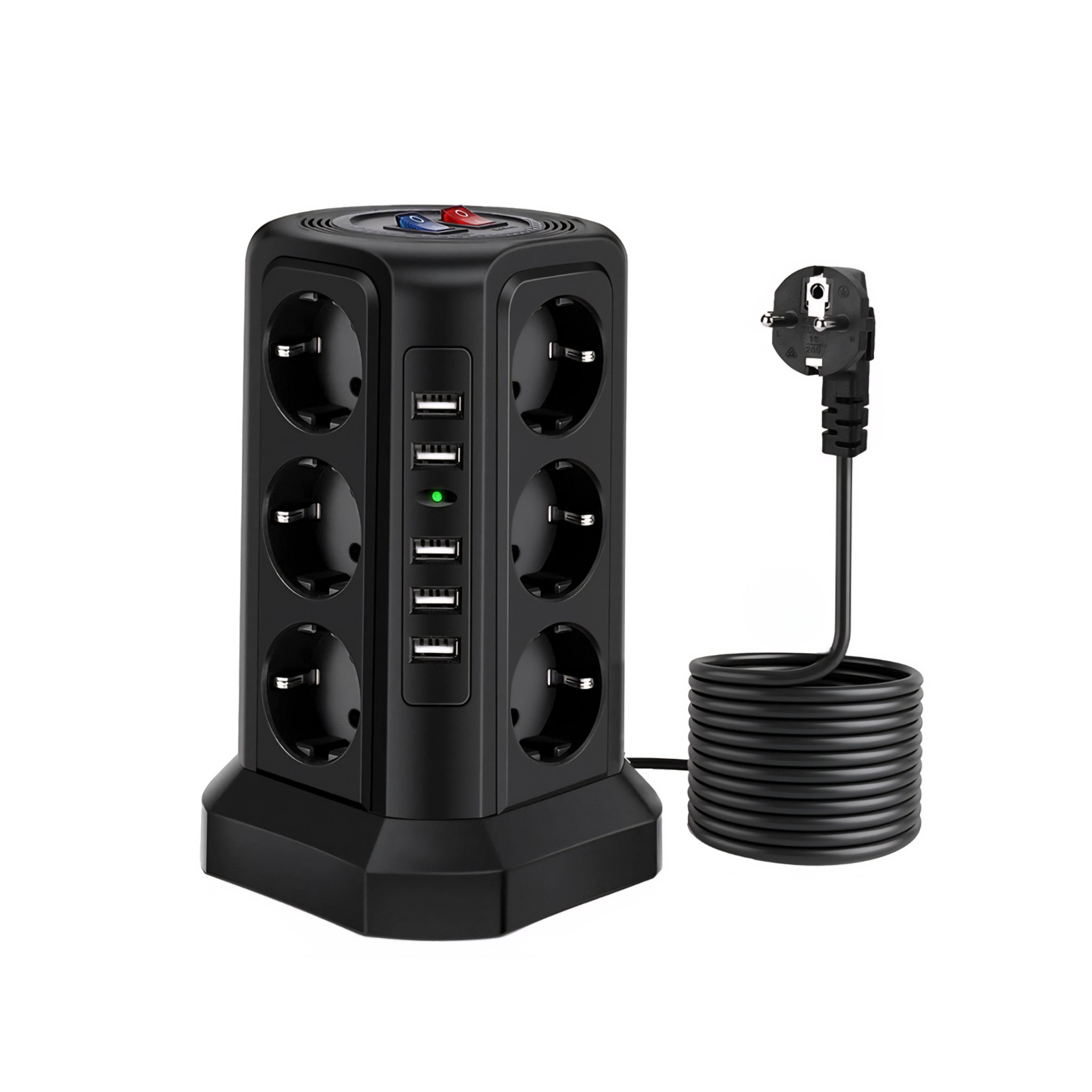 این چندراهی برق حرفه‌ای با ۱۲ پریز استاندارد و ۵ پورت USB (با مجموع جریان ۲.۴ آمپر) یک راهکار کامل برای تأمین انرژی انواع دستگاه‌هاست. مناسب برای شارژ همزمان گوشی هوشمند، تبلت، هدفون بی‌سیم، پاوربانک و همچنین اتصال لوازم خانگی بدون نیاز به آداپتورهای متعدد.