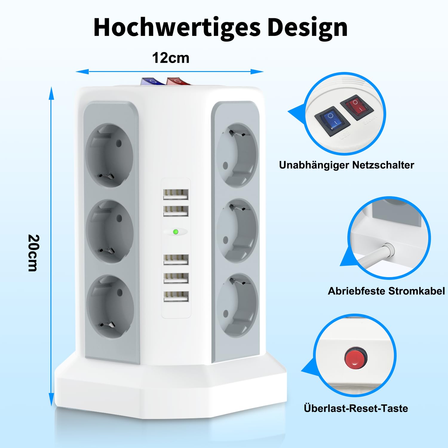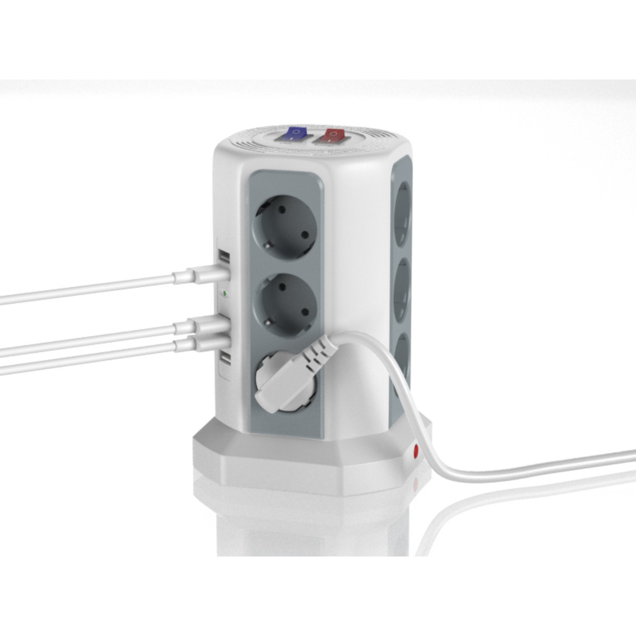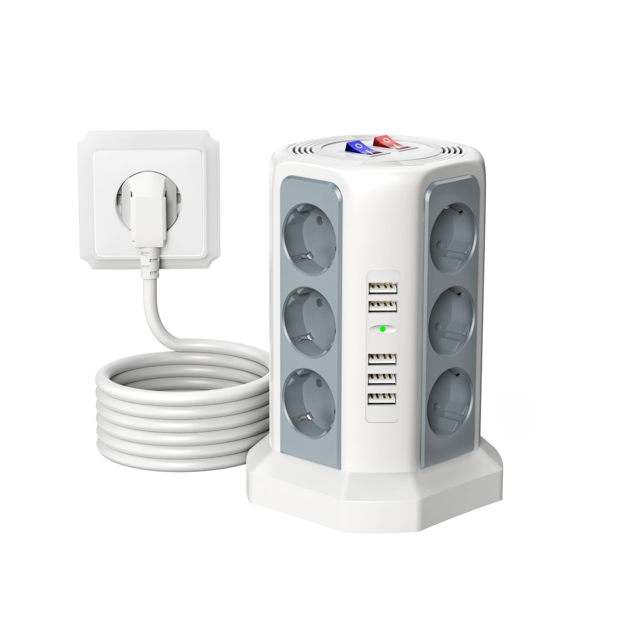 این چندراهی برق حرفه‌ای با ۱۲ پریز استاندارد و ۵ پورت USB (با مجموع جریان ۲.۴ آمپر) یک راهکار کامل برای تأمین انرژی انواع دستگاه‌هاست. مناسب برای شارژ همزمان گوشی هوشمند، تبلت، هدفون بی‌سیم، پاوربانک و همچنین اتصال لوازم خانگی بدون نیاز به آداپتورهای متعدد.