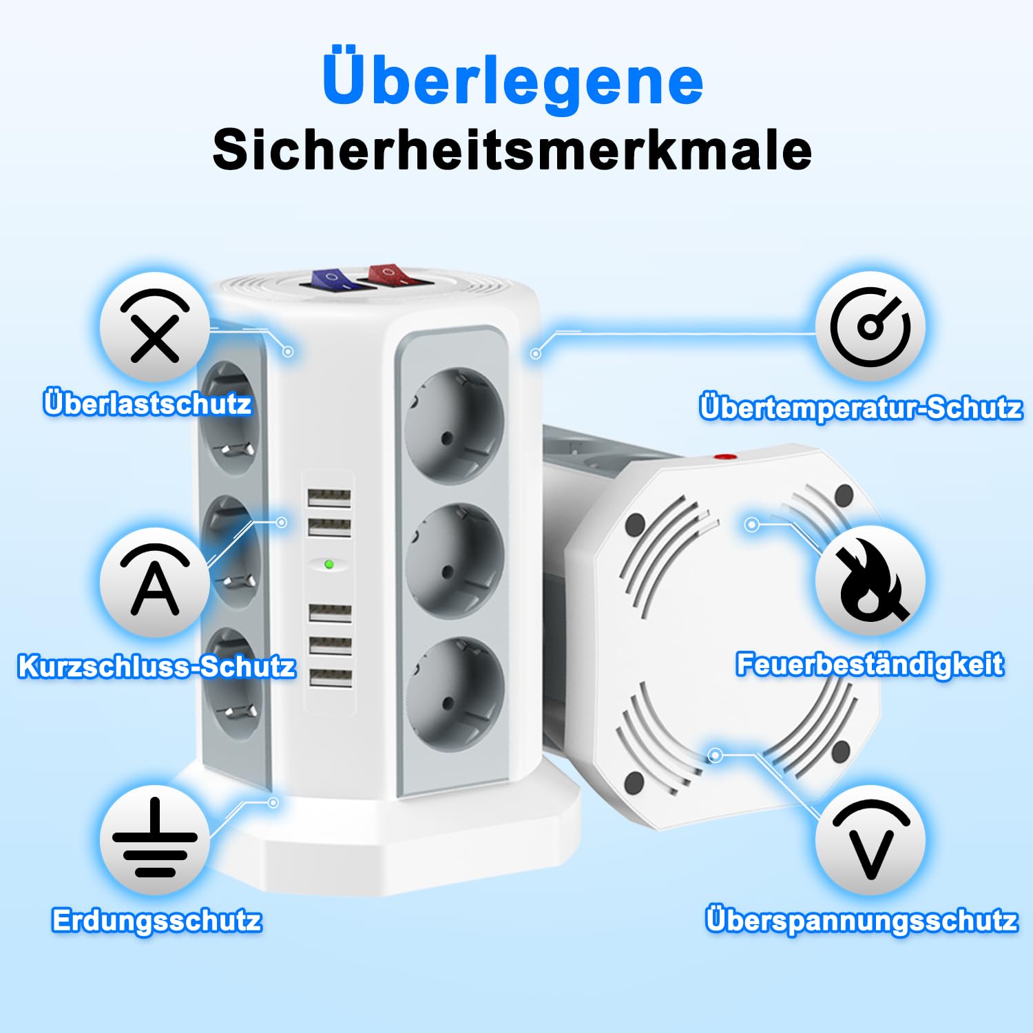 مجهز به محافظ نوسان برق، محافظ اتصال کوتاه و سیستم ارت ایمن برای حفاظت از تجهیزات گران‌قیمت. استفاده از مواد ABS/PC مقاوم در برابر آتش امنیت استفاده روزمره را تضمین می‌کند.