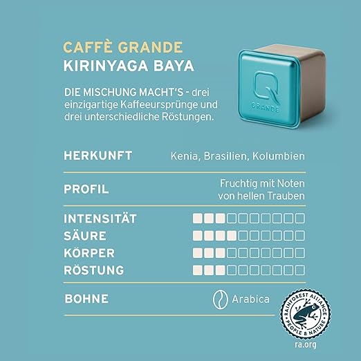 کپسول قهوه Qbo از دانه‌های ۱۰۰٪ عربیکا از سه منطقه‌ی مشهور جهان – کنیا، برزیل و کلمبیا – تهیه شده است. ترکیب دانه‌های برشته‌کاری روشن و تیره، طعمی ملایم و متعادل با نت‌های میوه‌ای و رایحه‌ی انگورهای روشن خلق می‌کند که عاشقان قهوه را مجذوب خود می‌سازد.